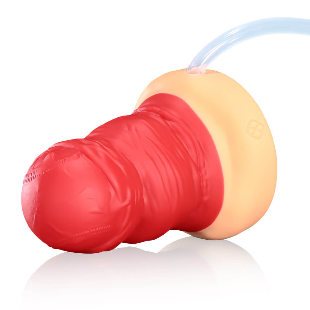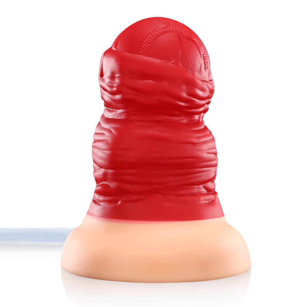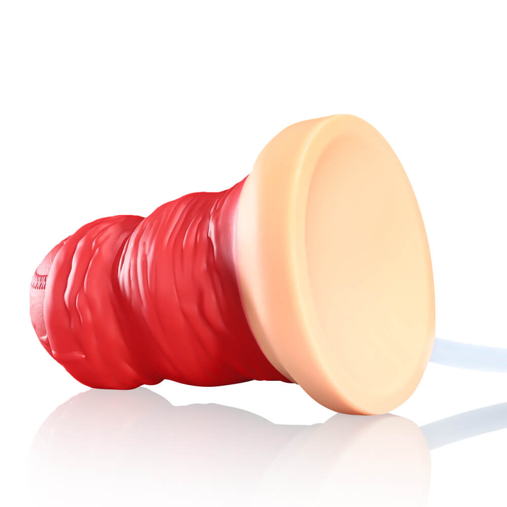 The bottom has a bionic skin color, contrasting with the red body, and includes a stable suction cup for multi-angle fixation on smooth surfaces. Its bold design is aimed at players seeking strong sensory experiences.